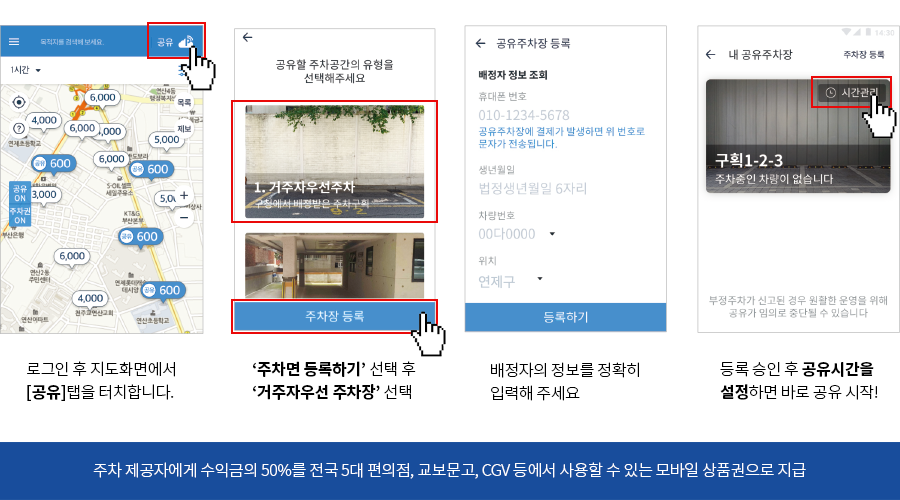 ![로그인 후 지도화면에서 [공유]탭을 터치합니다. → 주차면 등록하기 선택 후 거주자우선 주차장 선택 → 배정자의 정보를 정확히 입력해 주세요. 자 등록 승인 후 공유시간을 설정하면 바로 공유 시작! 주차면 제공자에게 수익금의 50%를 전국 5대 편의점, 교보문고, CGV 등에서 사용할 수 있는 모바일 상품권으로 지급](/portal/img/06/0601020400_01.png)