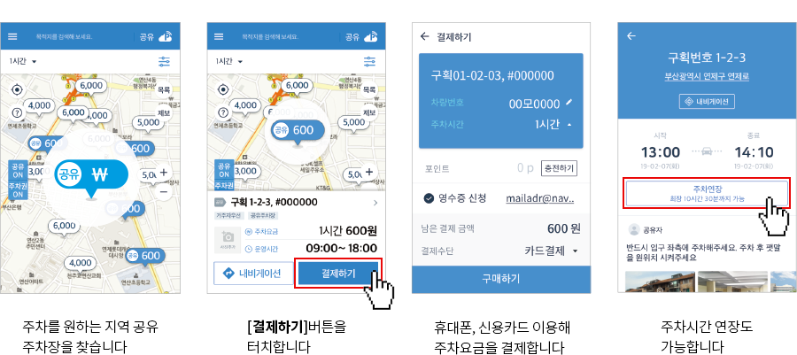 ![주차를 원하는 지역 공유 주차장을 찾습니다. → [결제하기]버튼을 터치합니다. → 휴대폰, 신용카드 이용해 주차요금을 결제합니다. → 주차시간 연장도 가능합니다.](/portal/img/06/0601020400_02.png)