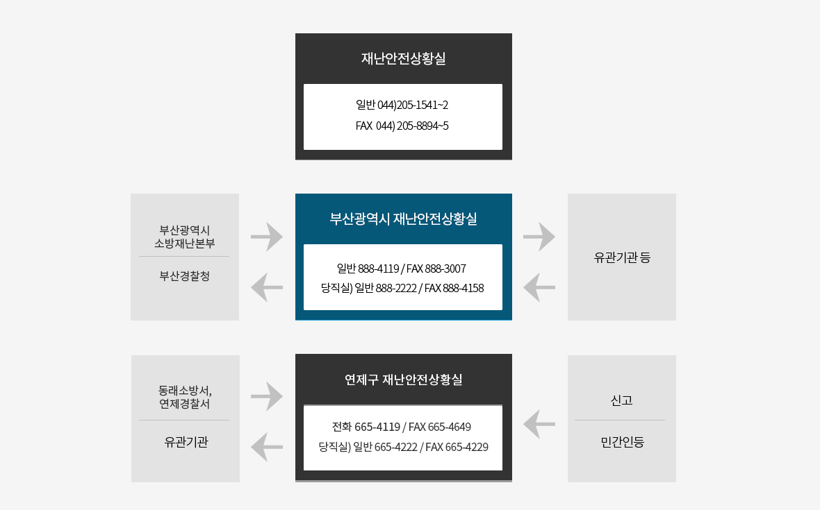 재난관리상황보고· 전파체계도 재난안전상황실 일반 044)205-1541~2 FAX 044)205-8894~5 부산광역시재난안전상황실 일반 888-4119 / FAX 888-3007 당직실 일반 888-2222 / FAX 888-4158 (소방본부,지방경찰청,유관기관등과 연계되어 상황을보고합니다) 연제구상황실 전화 665-4642 / FXA 665-4649 당직실 일반 665-4222 / FAX 665-4229 (재난관리상황보고 1차지입니다.민간인등이 신고할경우 소방서,경찰서,유관기관등과 연계되어 상황을보고합니다.)