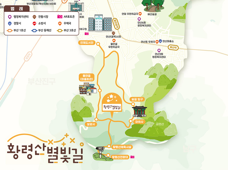 황령산(荒嶺山)은 연제구, 부산진구, 남구, 수영구에 걸친 도심지 산으로, 부산 시내 중심부에 자리하고 있어, 정상까지 오르는 길이 다양하다. 산역이 넓지 않아 3시간 안팎이면 정상까지 오를 수 있고, 황령산 체육시설, 황령산 함박골 체육시설 등이 위치해 가벼운 등산과 함께 운동기구를 이용하기에도 좋다. 산 정상에는, 조선시대 군사상 중요한 통신 수단이었던 봉수대가 위치해 숨겨진 역사적 사실과 함께 부산 시내 전경이 360도 파노라마처럼 펼쳐지는 멋진 경관을 즐길 수 있다. 황령산 전망대는 야경 핫플레이스로, 관광객들의 발길이 끊이지 않으며, 낮과 밤의 각기 다른 매력을 지닌 황령산의 모습을 엿볼 수 있다. 또한, 전망대 아래에 위치한 황령산 벚꽃길은 부산에서 손꼽히는 벚꽃 명소로, 3~4월 즈음에는 드라이브 코스로도 인기가 많은 곳이다. 시청방면 연제구 전망대에 [연제둘레길 AR 포토존]이 있어 스마트폰으로 QR코드를 스캔하면 증강현실 사진과 동영상 촬영 체험을 할 수 있다.